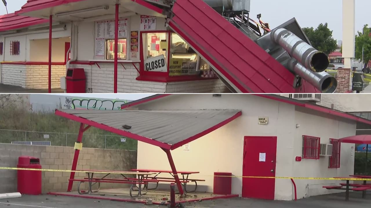 Aparatoso accidente de tránsito deja a un policía herido y pérdidas en Art's Burger de El Monte
