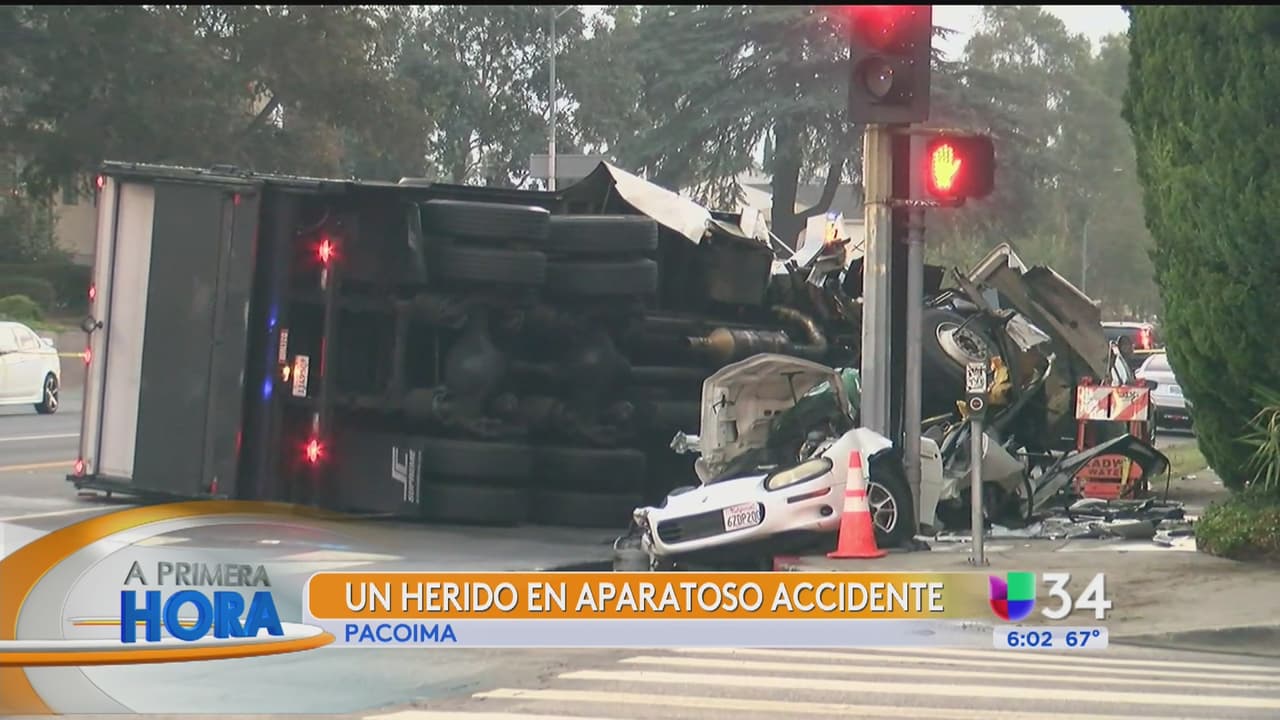 La fuerza del impacto dejó al camión volcado sobre la intersección del bulevar Laurel Canyon y la calle Branford. El coche deportivo quedó destrozado y prensado contra un poste de tendido eléctrico.