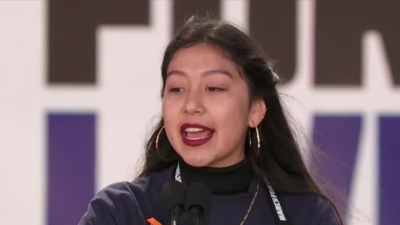 Parte del discurso de esta adolescente incluyó frases en español. “Hola. Buenas tardes”, saludó al acercarse al micrófono y expresó “¡La lucha sigue!” al alejarse con el puño derecho en alto.