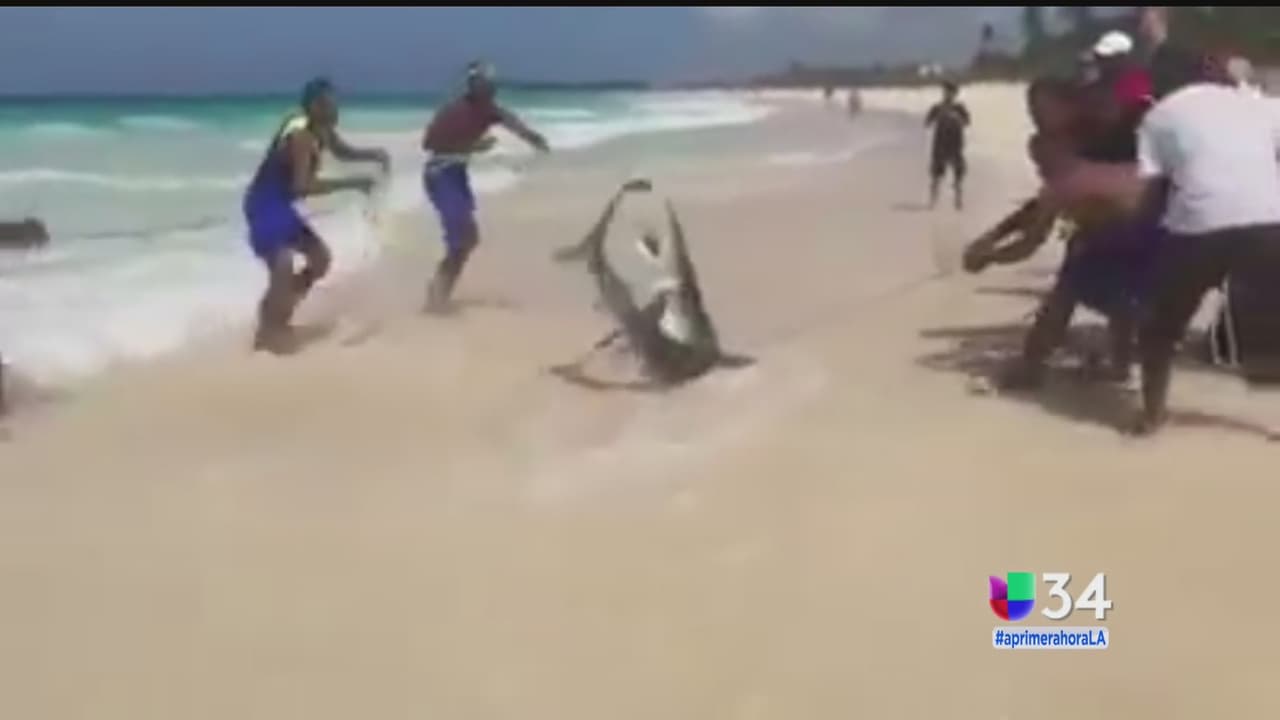 Socorristas y turistas en una playa de República Dominicana sacaron del mar a un tiburón azul para tomarse fotos con él.
