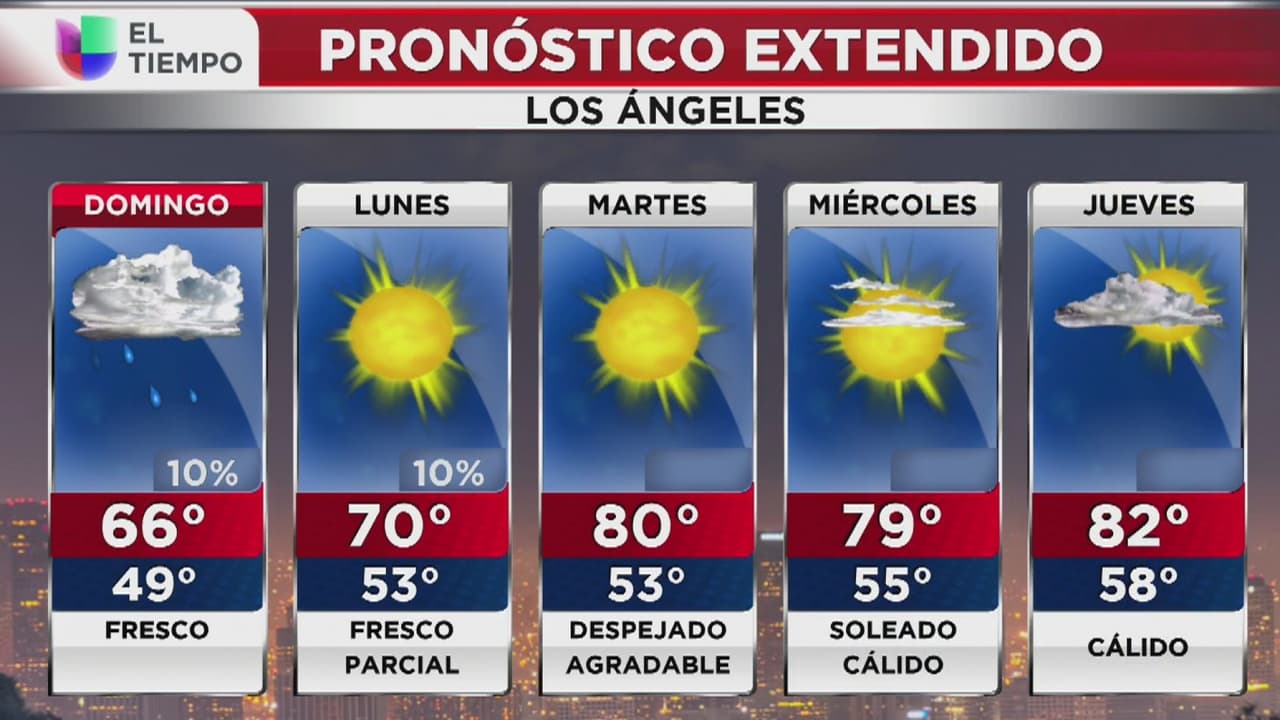 Se espera un 10% de probabilidades de precipitaciones, cielos mayormente nublados y que las temperaturas estén entre los 49 y 66 grados Fahrenheit en Los Ángeles y sus alrededores.