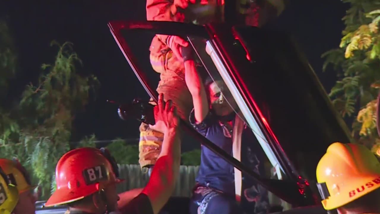 Bomberos de Los Ángeles rescatan a una mujer que se volcó y quedó atrapada en el auto