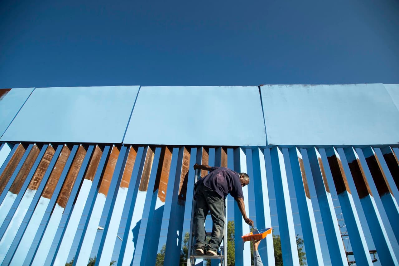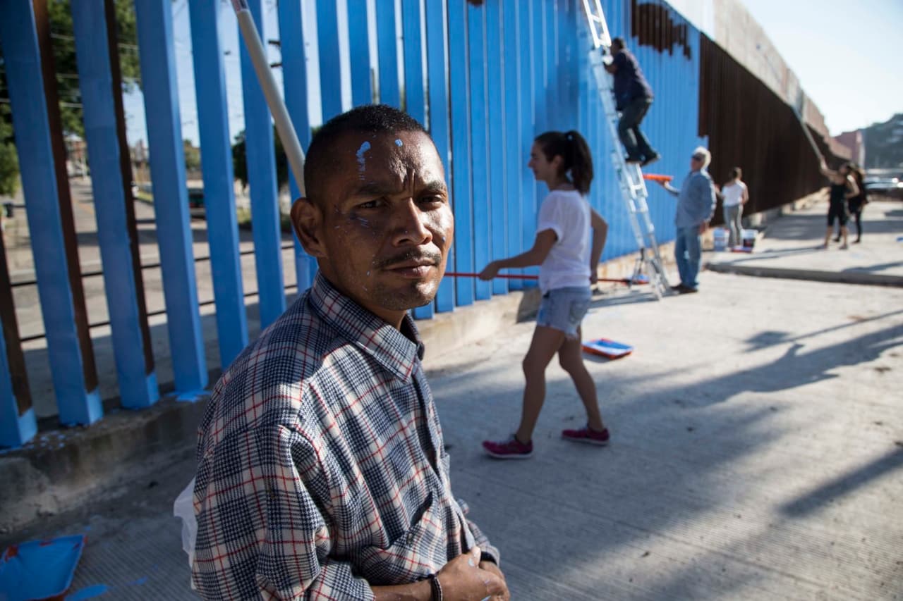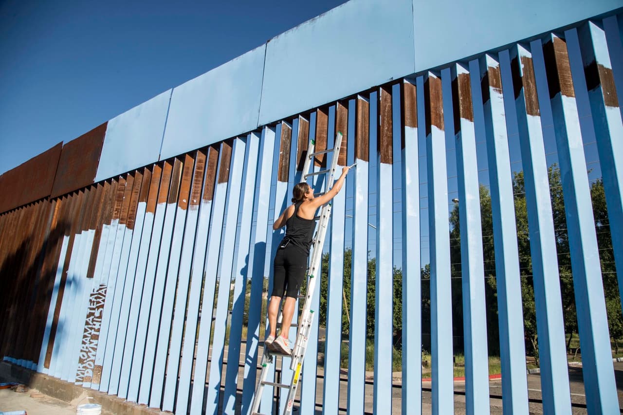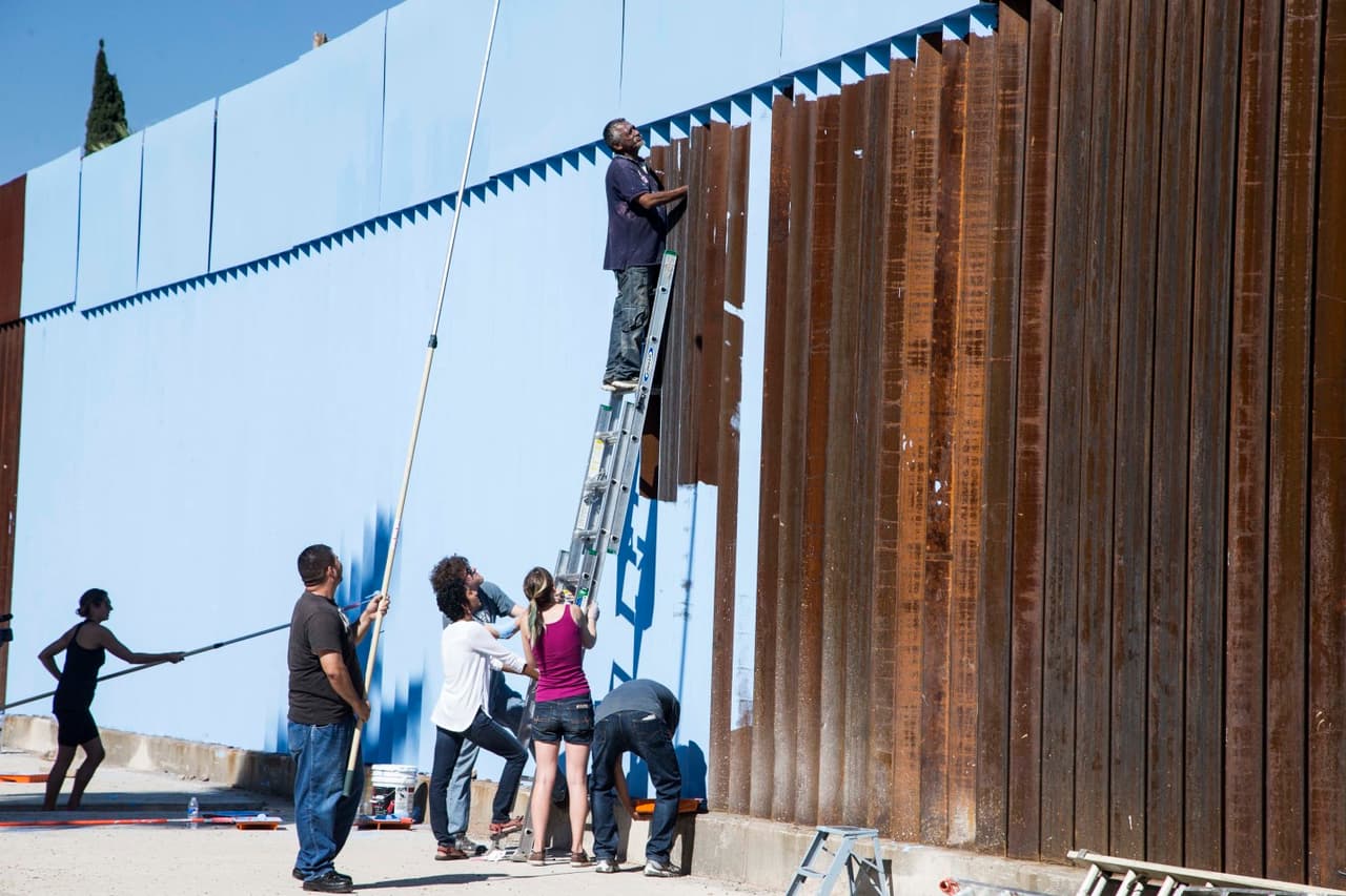 Artistas y voluntarios pintan la cerca entre México y EEUU como parte del proyecto "Borrando fronteras".