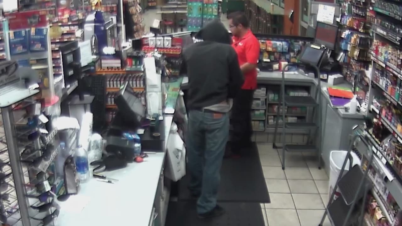 Autoridades del condado de Orange buscan a un ladrón que entró a una gasolinera Shell de Santa Ana para robarle al dependiente. El sospechoso, un hombre hispano, entró al local encapuchado y demandó dinero mostrando una pistola.