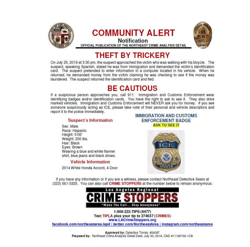 Autoridades de Los Ángeles alertan sobre un falso agente de ICE, quien según reportes pide dinero a inmigrantes en zonas predominantemente hispanas.