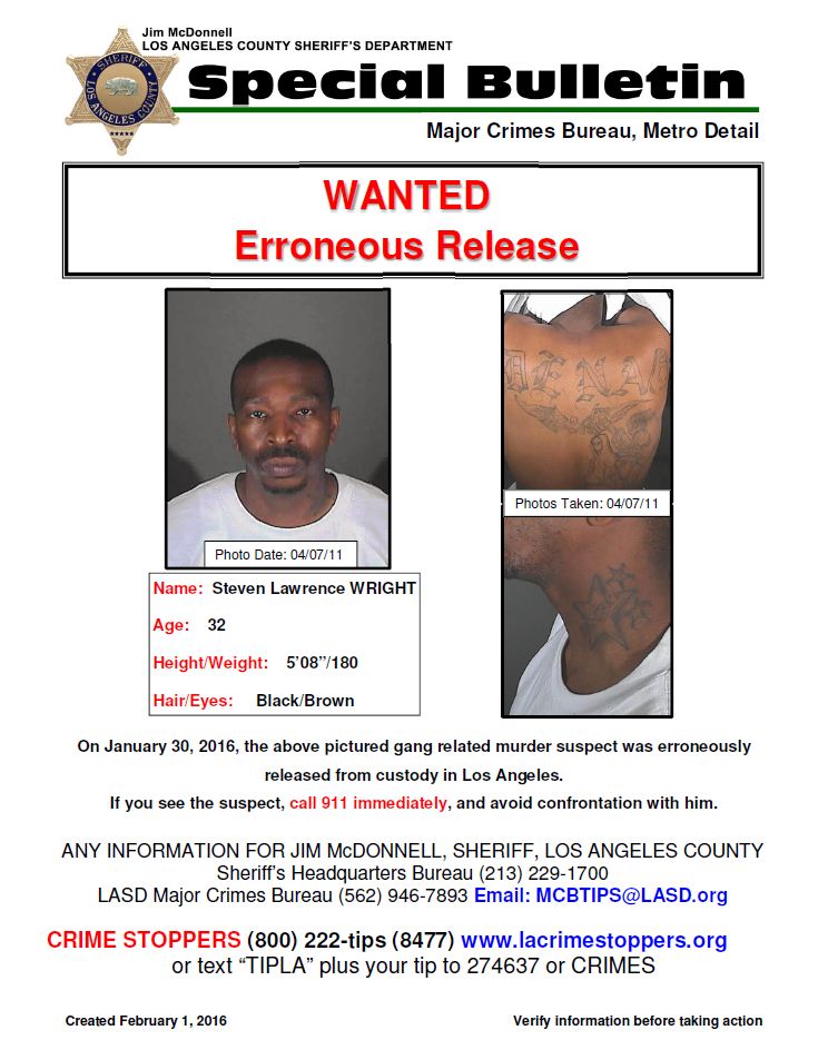 "El Departamento del Sheriff se toma muy seriamente este asunto y está totalmente implicado en poner al preso Wright bajo custodia, se está persiguiendo agresivamente un número de pistas sobre su localización. Además, como en todos los casos de liberaciones erróneas llevaremos a cabo una crítica revisión del incidente para hacer las mejoras necesarias al sistema", se lee en un comunicado de LASD.