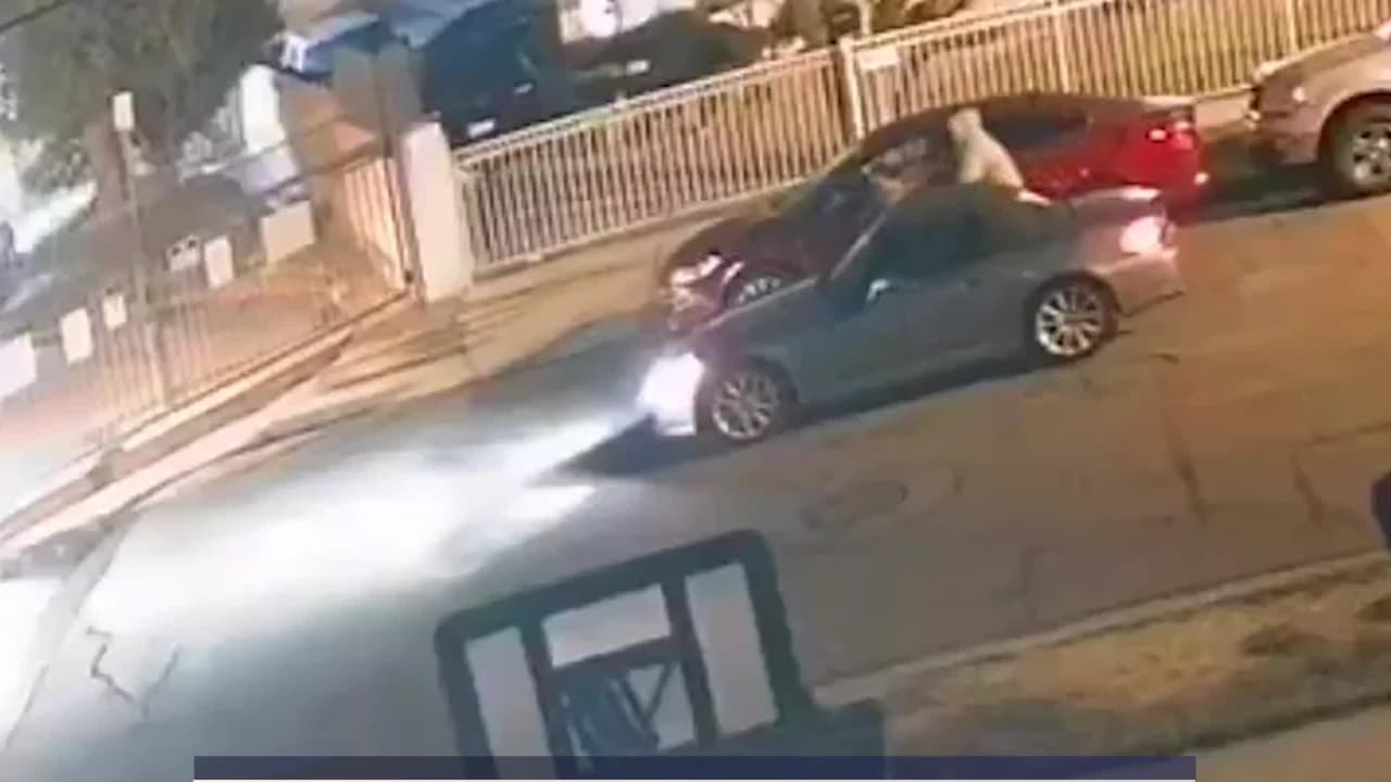 Un video de seguridad capta como una mujer sale de un auto en movimiento, pero un hombre la atrapa y la obliga a regresar al auto. El incidente ocurrió en el área de Bell Garden. Si viste o sabes algo por favor llama al sargento B. Benson al (562) 806-7694.
