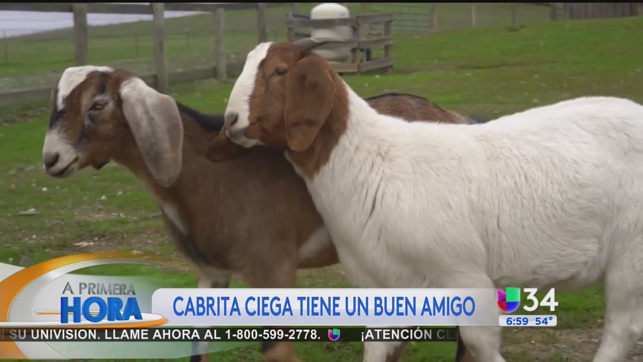 Marcia, una cabra ciega, cuenta con el apoyo de Maurice, su compañero y guía en un albergue para animales.