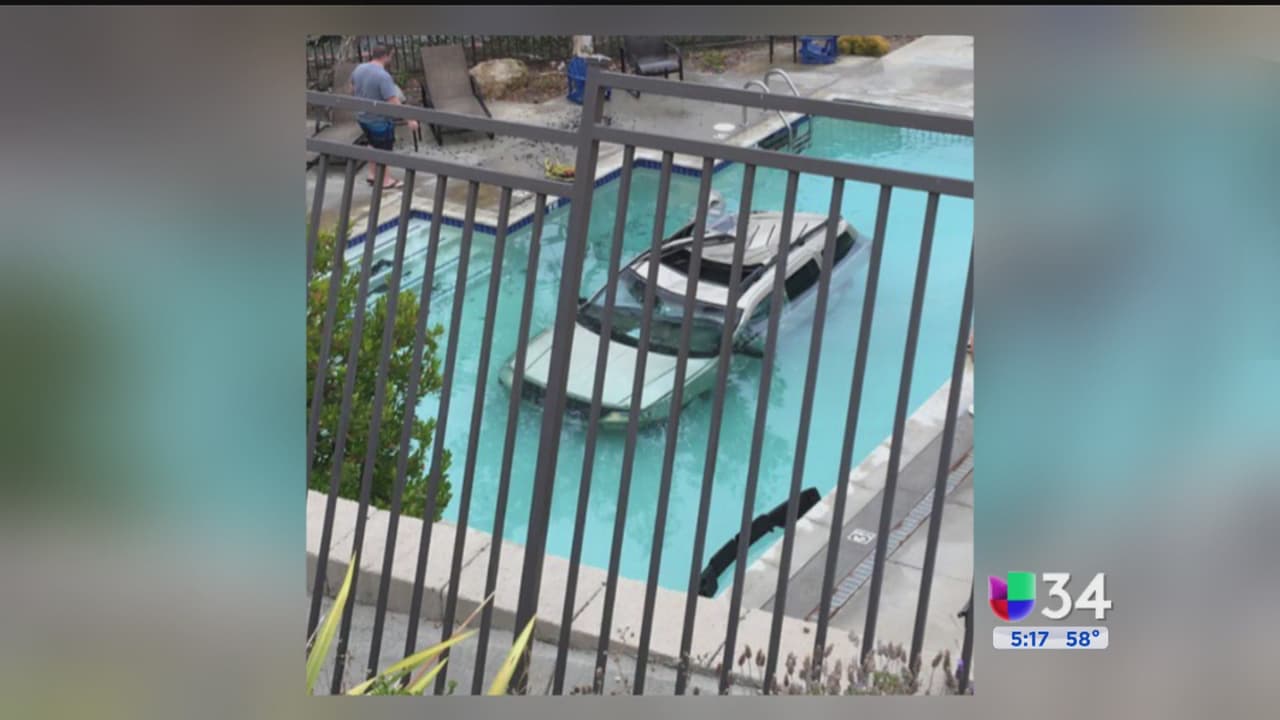 Una conductora confundió los pedales de su camioneta y cayó 10 pies dejando el vehículo sumergido en una piscina.