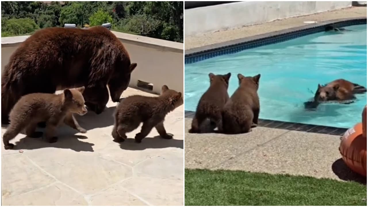 Captan a una osa en una alberca mientras muestra a sus cachorros cómo nadar