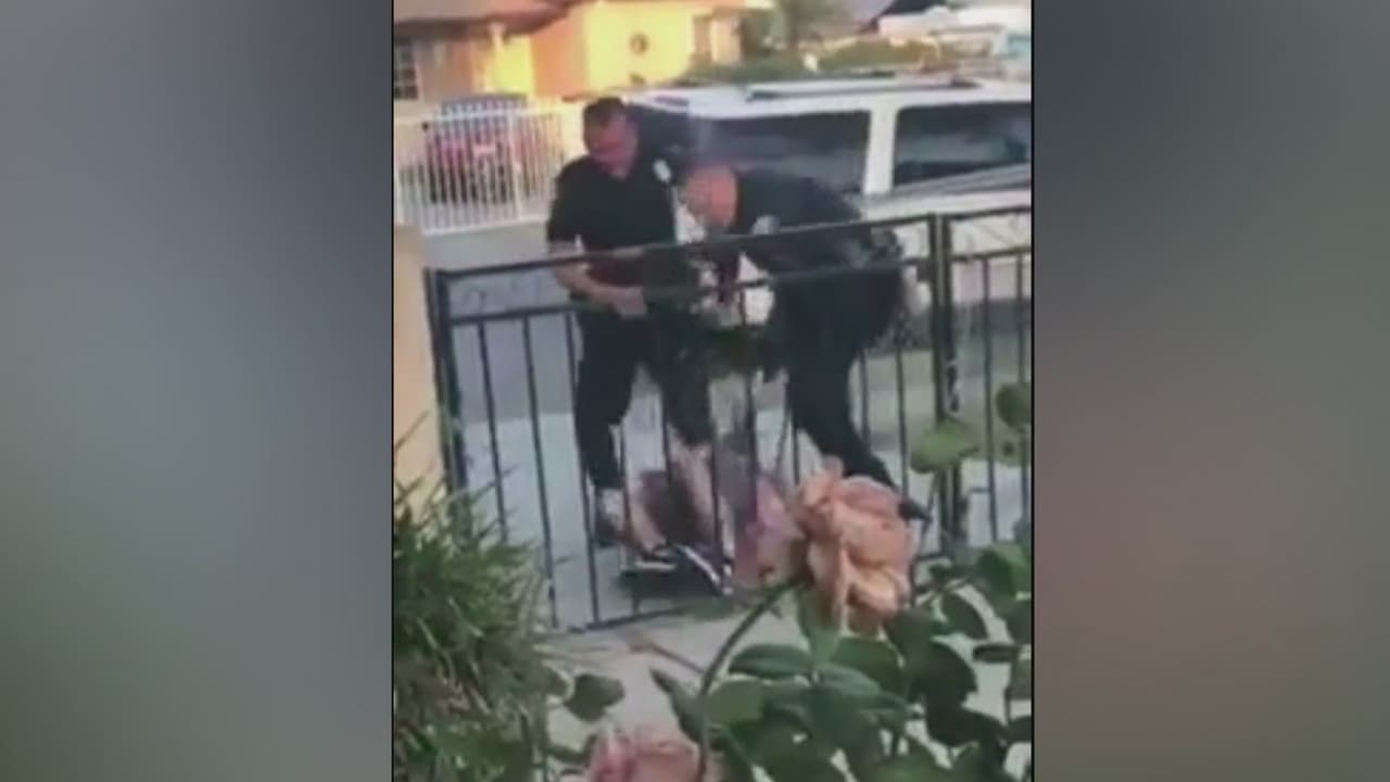 Una mujer grabó el violento altercado ocurrido en el sur de California y en el que tres oficiales de la Policía de Santa Ana someten con aparente uso excesivo de la fuerza a un sospechoso de robo de vehículo.