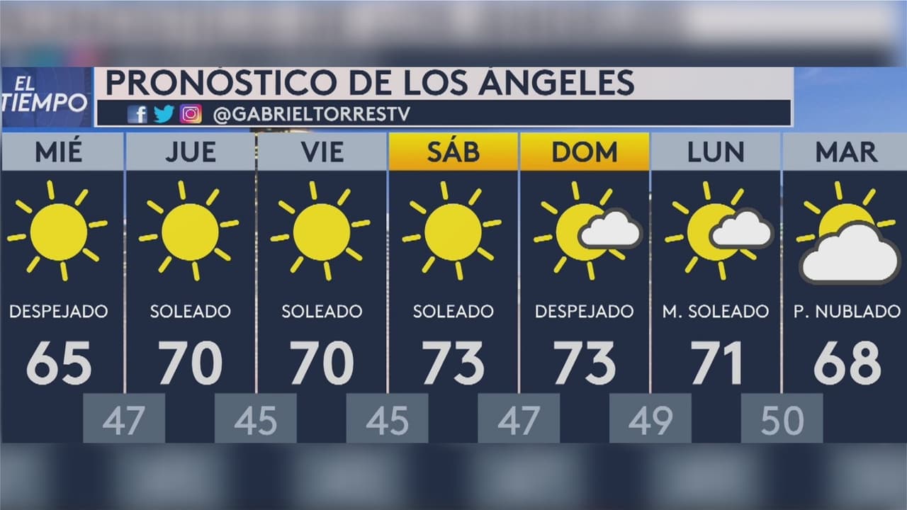 Se espera una temperatura mínima de 47 grados Fahrenheit y una máxima de 65 grados. No hay probabilidad de lluvia para este día y se prevé un resto de semana soleado y fresco.