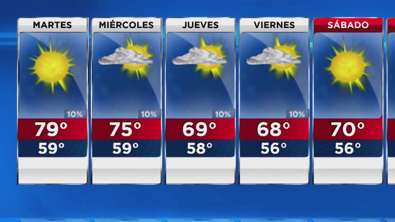 La temperatura máxima de hoy será de 79 grados, y la mínima de 59 grados. A partir del miércoles disminuye un poco el calor y el cielo estará más nublado, aumentando la posibilidad de precipitaciones.