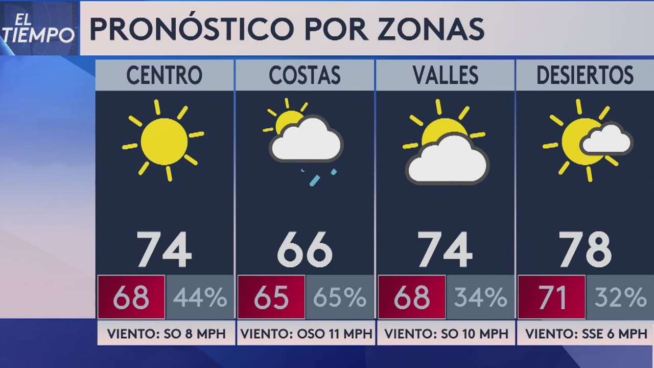 Será una tarde soleada y con temperaturas máximas alrededor de los 74 grados Fahrenheit. Según el pronóstico, después del mediodía se esperan vientos. No hay probabilidades de lluvia.