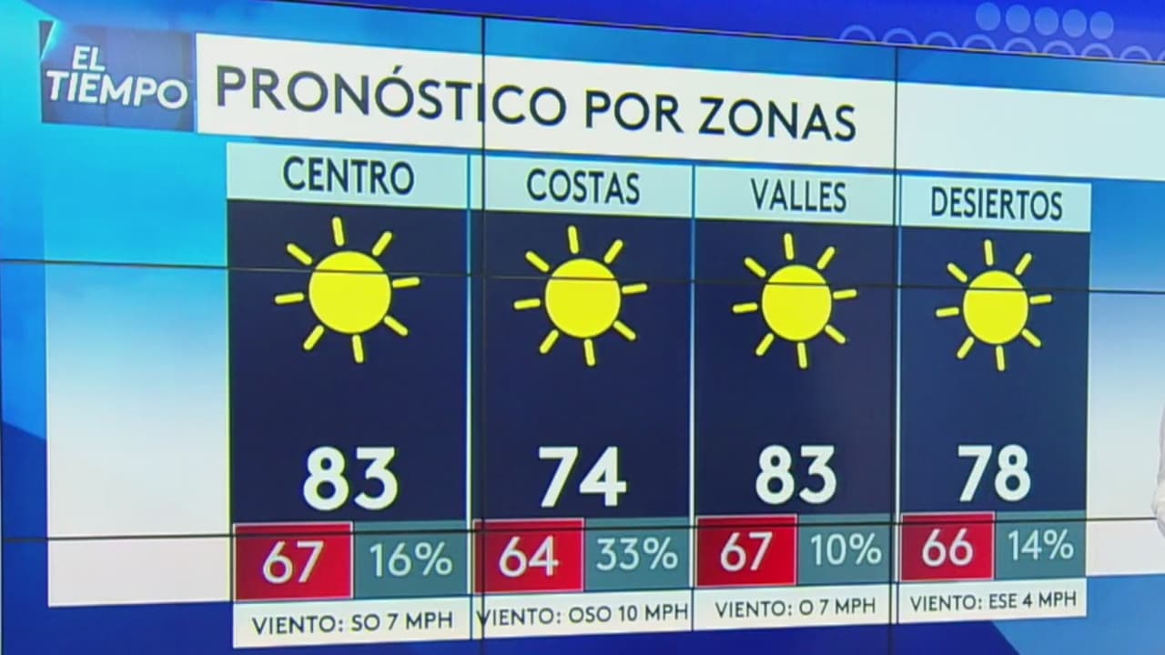 Será una tarde de cielo despejado y con temperaturas máximas alrededor de los 83 grados Fahrenheit. El viento se mantiene moderado y no se esperan lluvias.
