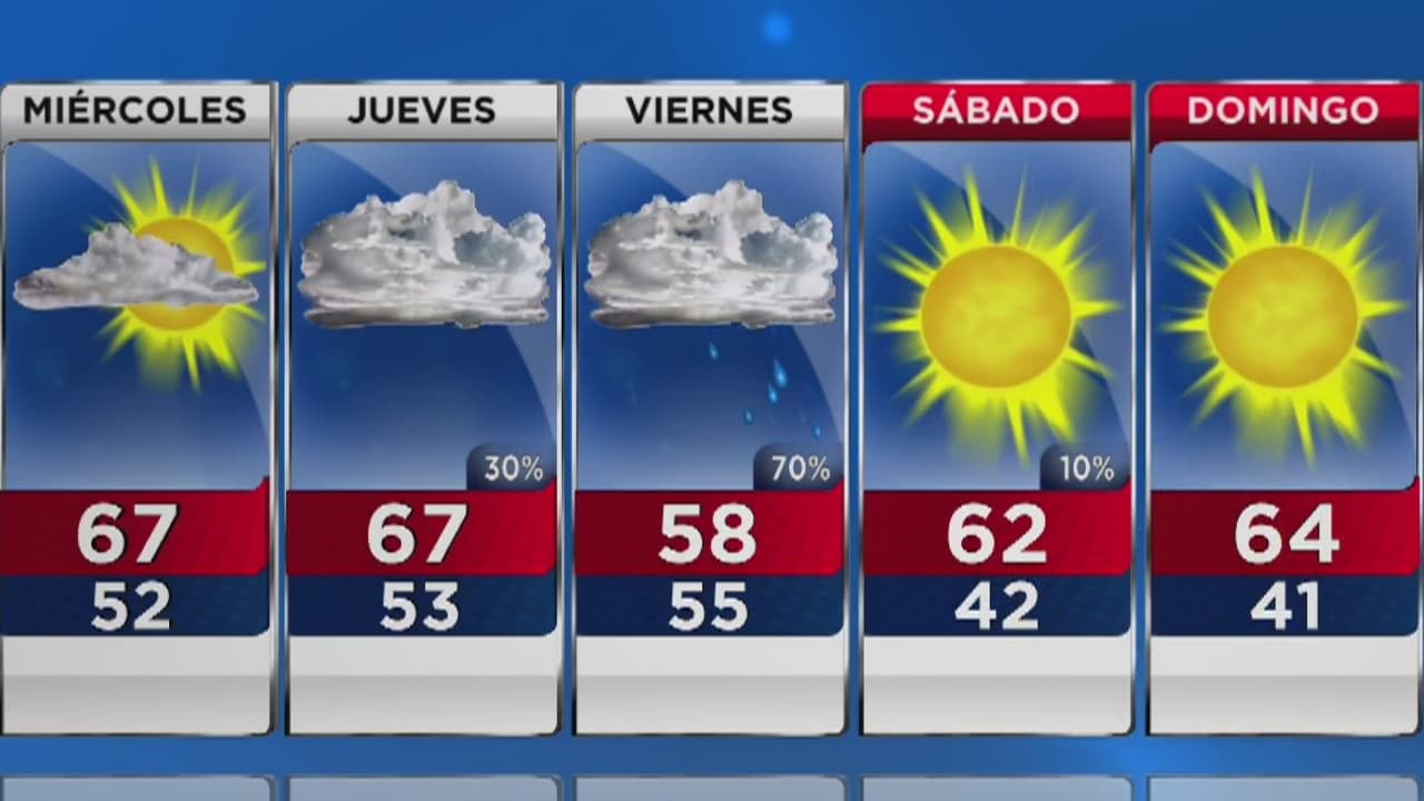 Se prevé que este jueves vuelvan las lluvias, pero desde hoy se comenzarán a sentir temperaturas más bajas y se recomienda salir con un poco de abrigo. La máxima de este miércoles será de 67 grados y la mínima de 52 grados.