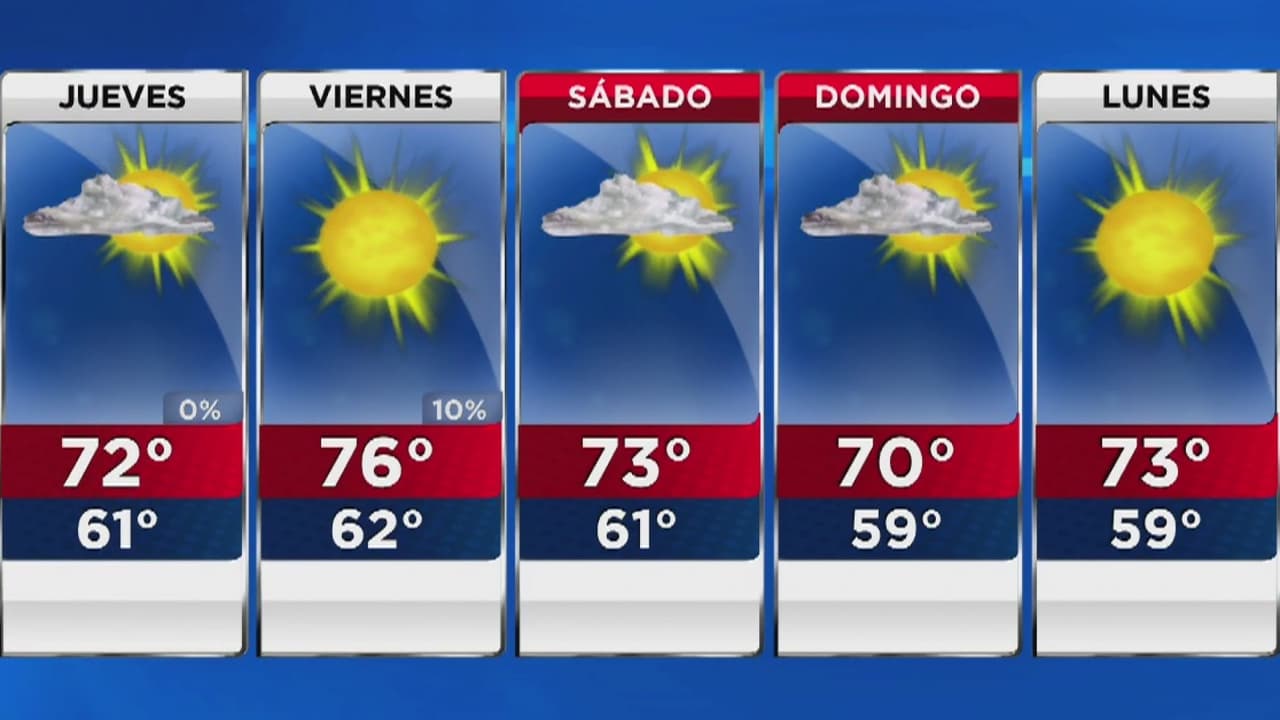 Durante las primeras horas de la mañana habrá una ligera llovizna y capa marina en la ciudad. La temperatura máxima del día será de 72 grados, y la mínima de 61 grados. El viernes será más soleado y cálido.