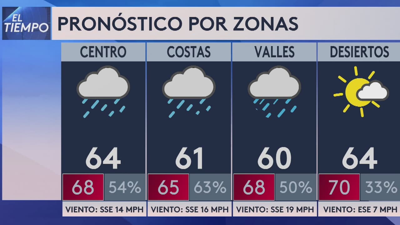 Se pronostica una tarde con vientos, lluvias y tormentas, acompañadas de temperaturas máximas alrededor de los 64 grados Fahrenheit. Hay alerta del tiempo en varias zonas del sur de California.
