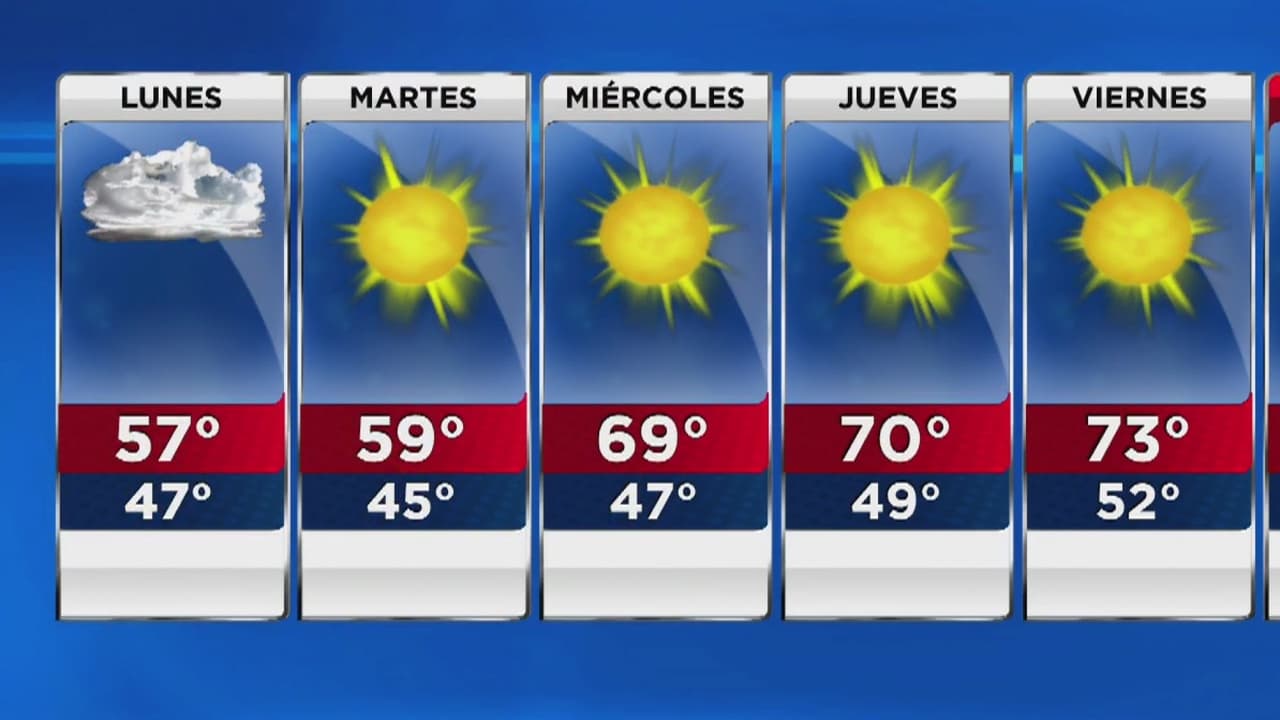 Hay probabilidades de lluvia para este día, en el que se mantiene un poco del frío del fin de semana. La máxima temperatura será de 57 grados y la mínima de 47 grados. A partir de este martes se esperan días soleados.