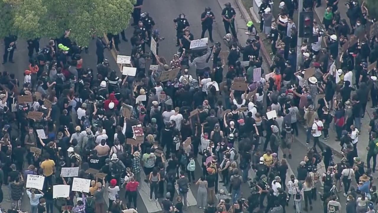 Cientos de manifestantes se congregan frente a la residencia del alcalde Garcetti, en Hancock Park