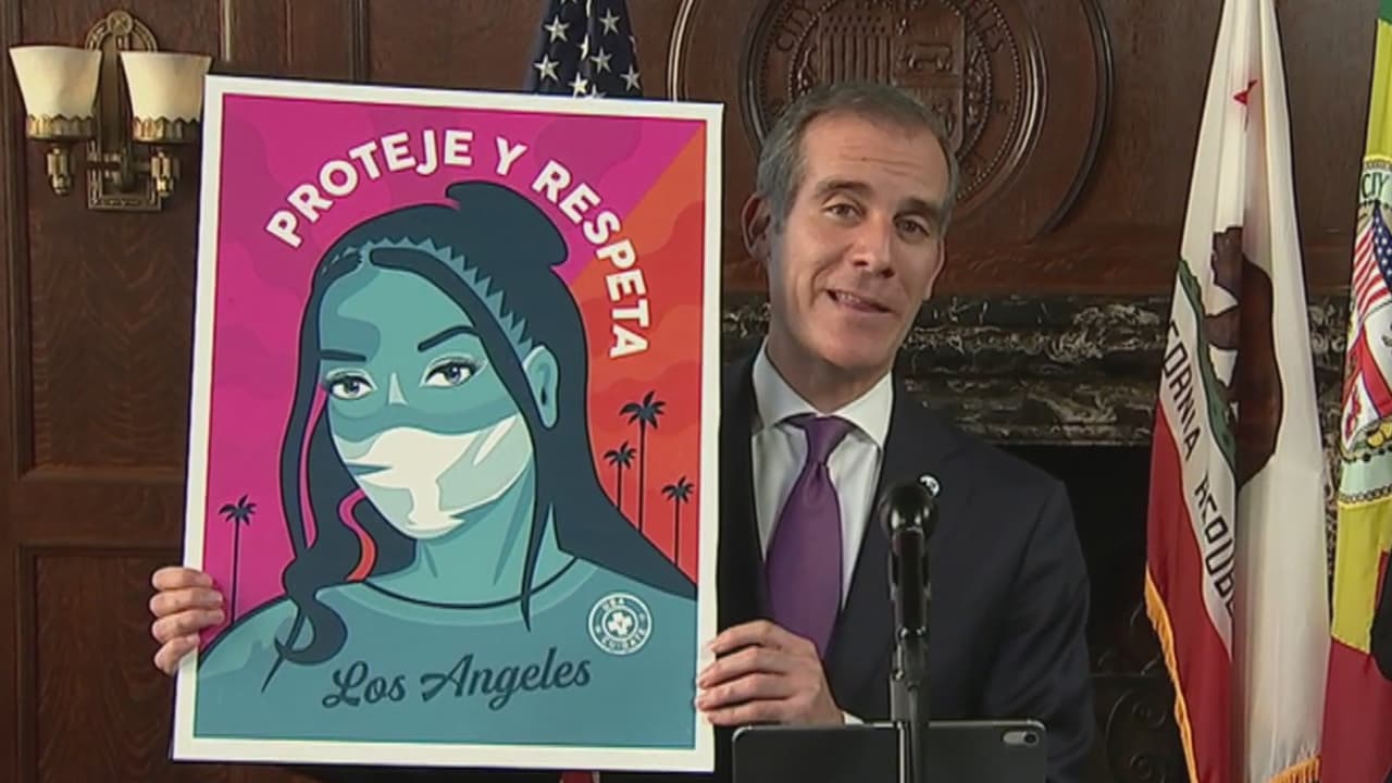 Con afiches, el alcalde de Los Ángeles busca promover el uso de las mascarillas