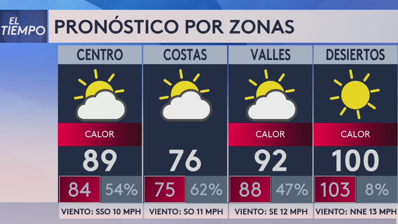 La ola de calor continúa en el sur de California y en la ciudad de Los Ángeles se espera una temperatura máxima de 89 grados Fahrenheit a lo largo del día. El cielo permanecerá mayormente nublado durante la tarde.