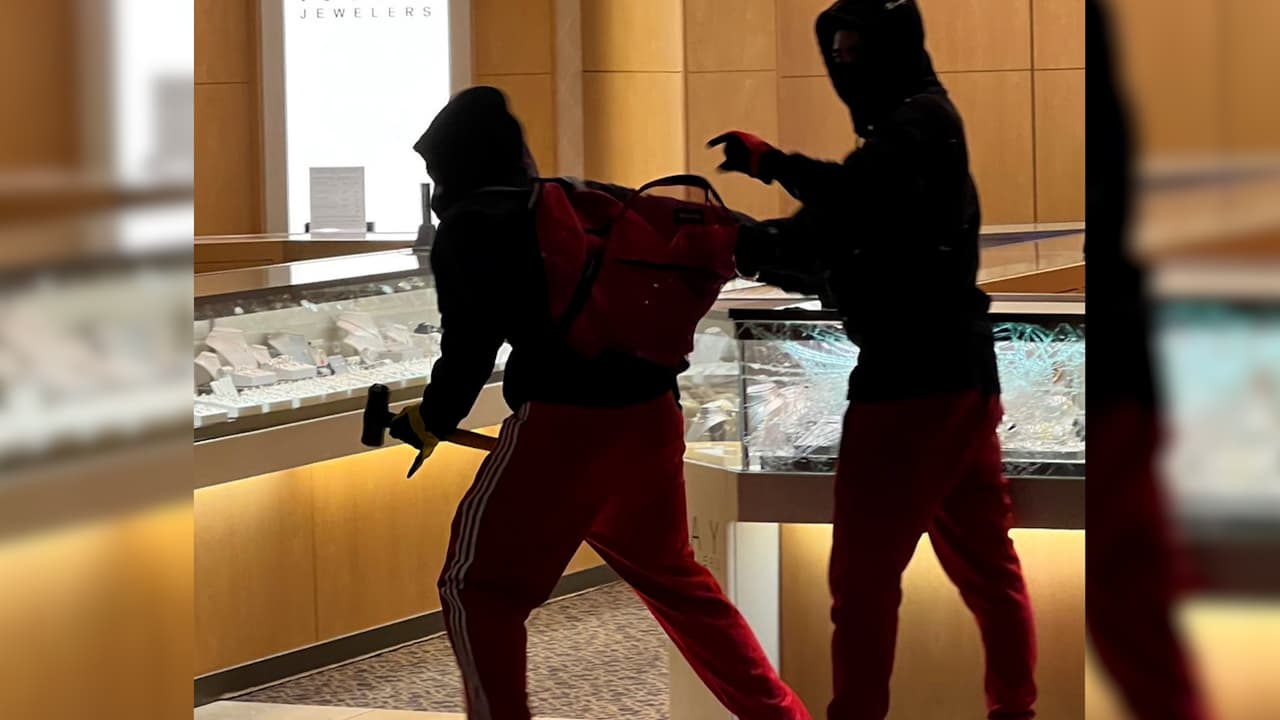 La policía de Brea busca a dos hombres que robaron en un centro comercial. Los sospechosos entraron con su cara cubierta y con martillos rompieron los vidrios de Kay Jewelers y robaron artículos de valor.