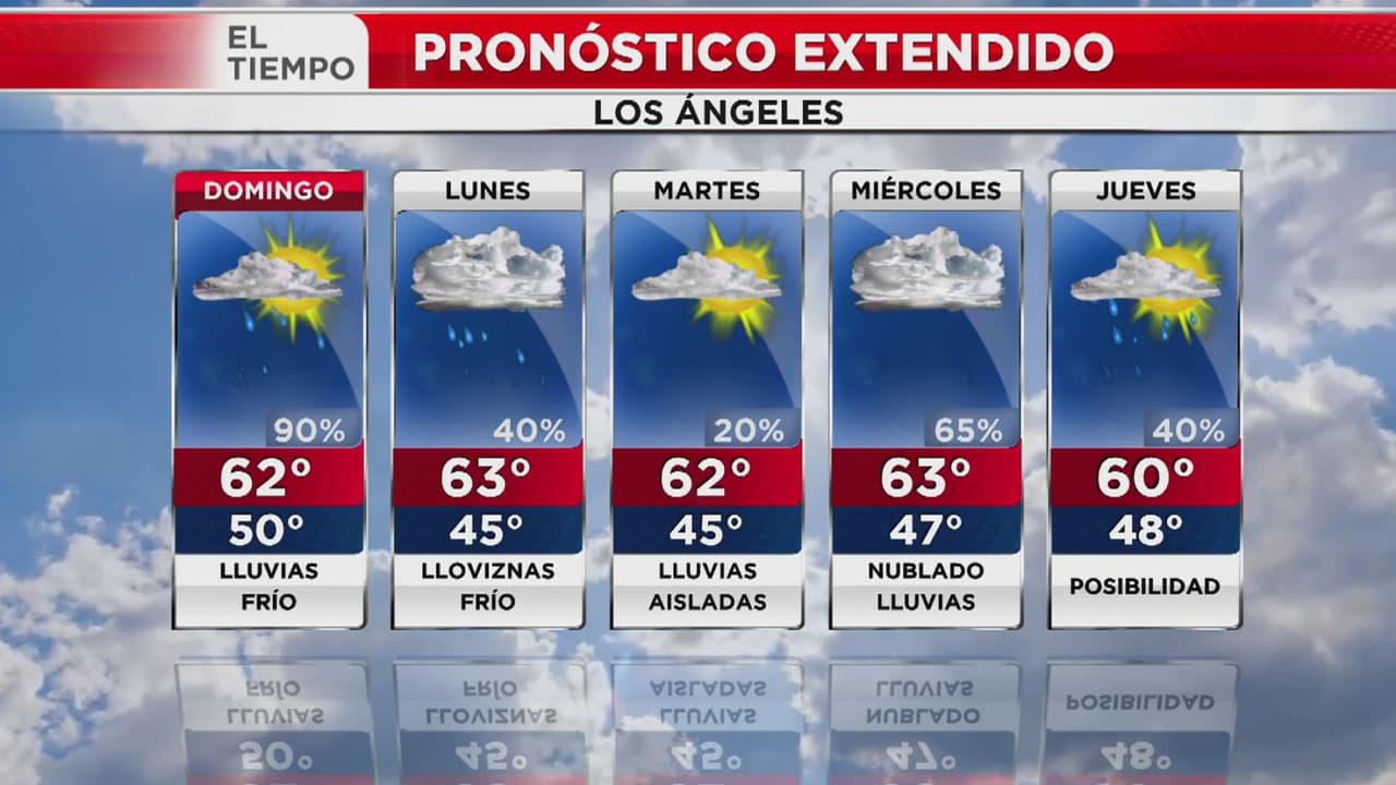 Se espera un 90% de probabilidades de precipitaciones, cielos parcialmente nublados y que las temperaturas estén entre los 50 y 62 grados Fahrenheit en Los Ángeles y sus alrededores.