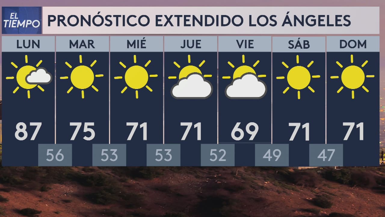 Se espera una temperatura mínima de 56 grados Fahrenheit y una máxima de 87 grados. No hay probabilidad de lluvia para este día y se prevé un resto de semana más fresco.