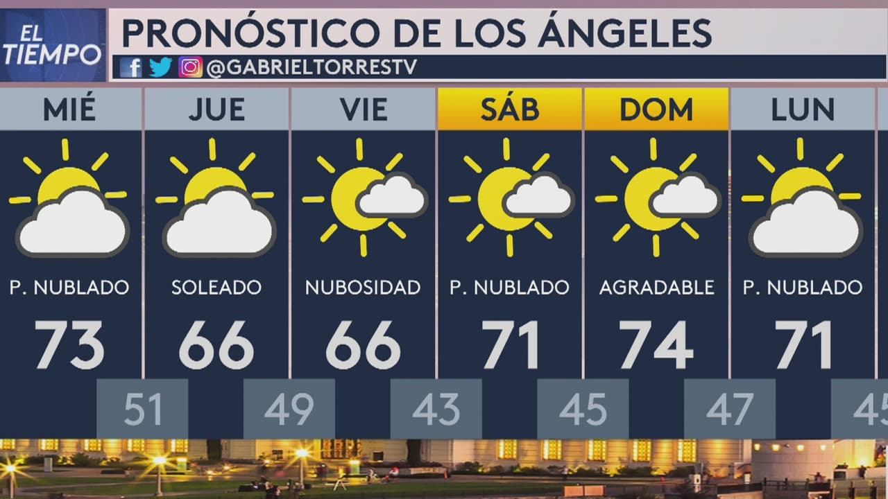 Se esperan cielos parcialmente nublados y que las temperaturas estén entre los 51 y 73 grados Fahrenheit en Los Ángeles y sus alrededores. No se pronostican lluvias durante el día.