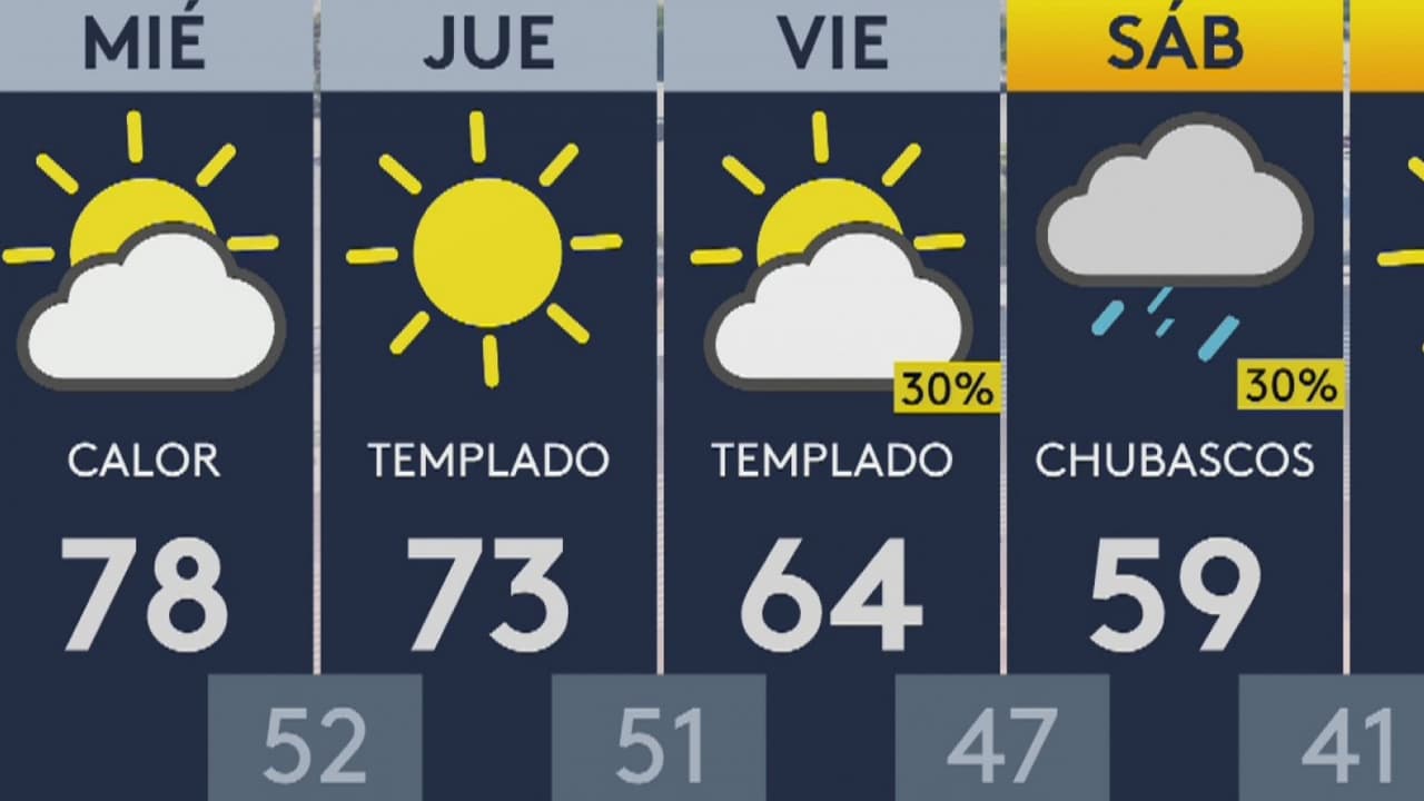 Las temperaturas máximas llegarán a los 78 grados Fahrenheit y las mínimas se ubicarán en los 52. Los cielos estarán parcialmente nublados y las probabilidades de lluvia son nulas.