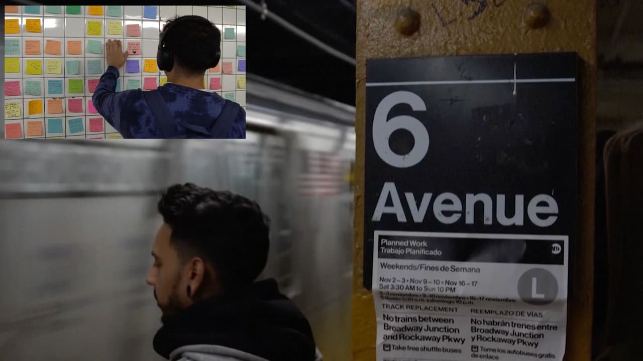 Miles de notas adhesivas se alinean en el túnel de baldosas blancas del metro que conecta la 6.ª y la 7.ª Avenida. Cada nota contiene los pensamientos, aspiraciones, miedos, chistes o garabatos de un pasajero del metro.