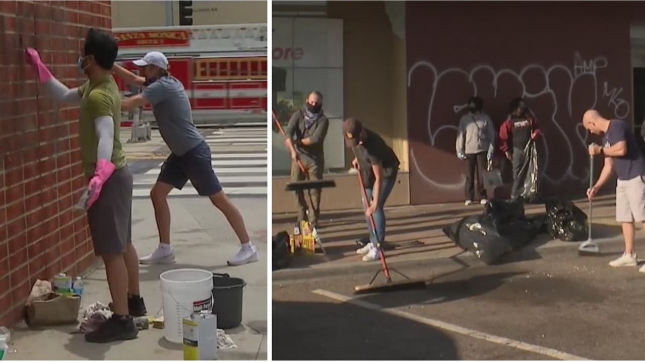 Decenas de voluntarios se unen para limpiar las calles de Santa Mónica vandalizadas tras las protestas