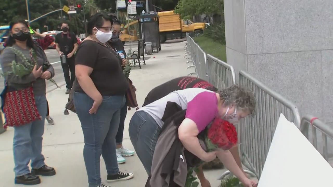 Activistas recolectan flores para ponerlas frente al Hall Of Justicia en el centro de Los Ángeles