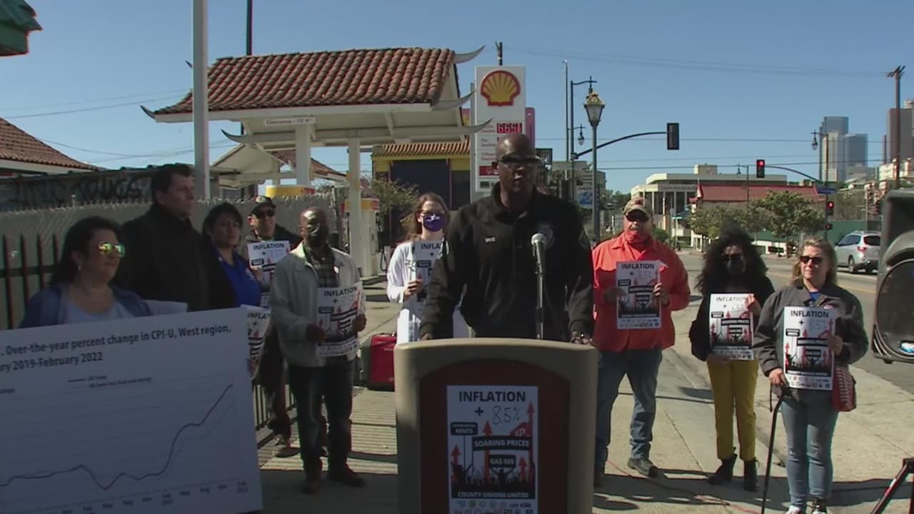 Decenas de trabajadores sindicales del sector público del condado de Los Ángeles se congregaron este martes al frente de una estación de gasolina para protestar por el aumento de los precios al consumidor y para exigir un aumento salarial. “Tengo varios compañeros que no pueden acudir al trabajo por falta de dinero para transportarse”, manifestó una empleada. Este martes se informó que la inflación se aceleró al 8.5% en marzo.