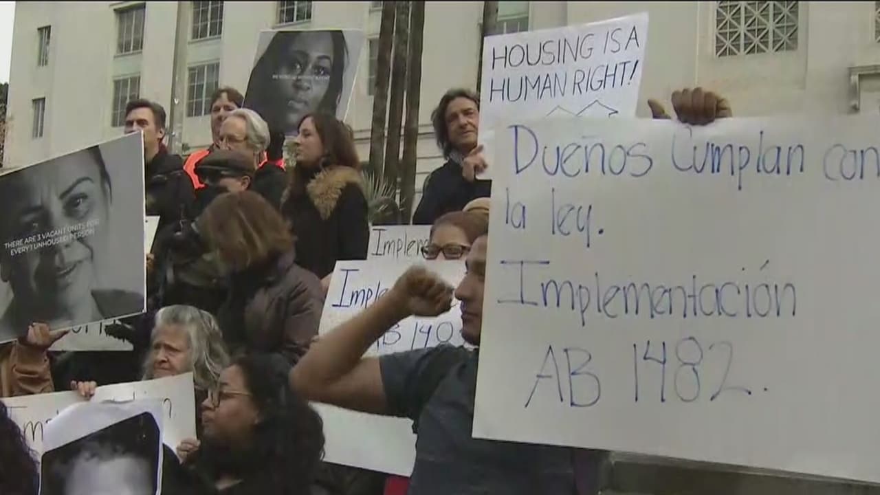 Un grupo de personas llegó este viernes a manifestarse frente al Concejo de la ciudad para pedir que se respete la ley AB 1482, que entró en vigor el pasado 1 de enero y que impone un límite del 5% para el incremento de las rentas a los dueños de propiedades en alquiler.