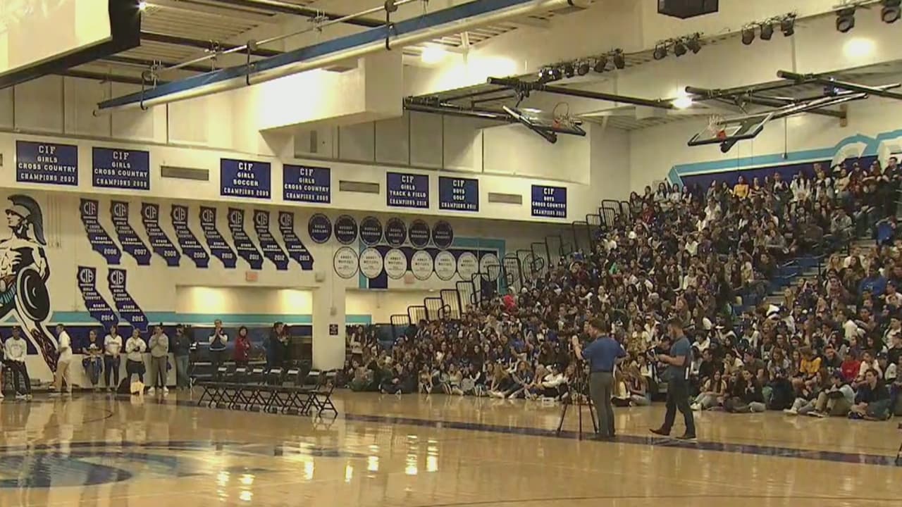 Jugadores de los Dodgers sorprenden a estudiantes de Saugus High School durante un evento escolar