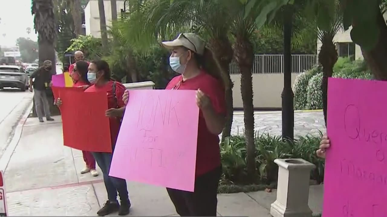 Empleados del sector hotelero se congregaron con pancartas a las afueras del hotel JW Marriott Santa Mónica Le Merigot para exigir que reintegren a Margarita Santos. Al parecer, la mujer fue despedida bajo el argumento de que falló en notificar que tenía síntomas, pero ella dice que reportó sobre los dolores de cabeza que padecía.
