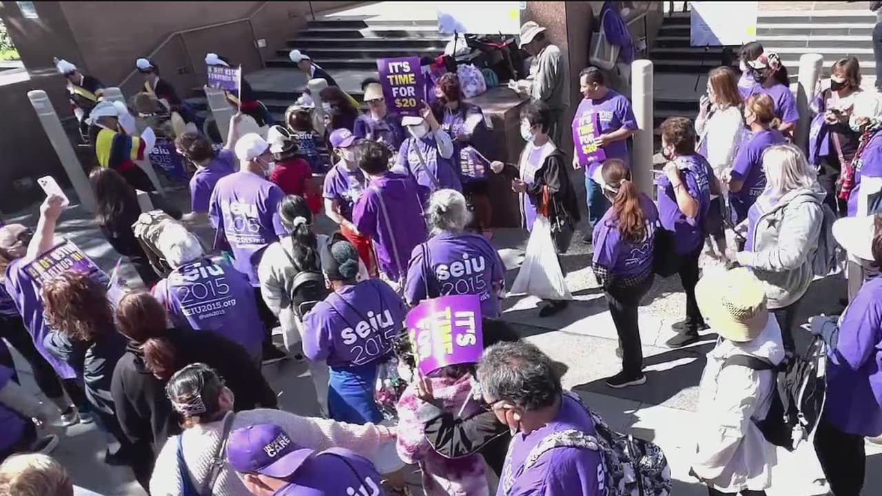 Decenas de estos empleados protestaron a las afueras de la oficina de la Junta de Supervisores del condado de Los Ángeles para pedir que su salario aumente a 20 dólares la hora. Además, entre sus peticiones está la inclusión de un plan de pensión, beneficios de seguro médico y vacaciones pagadas.