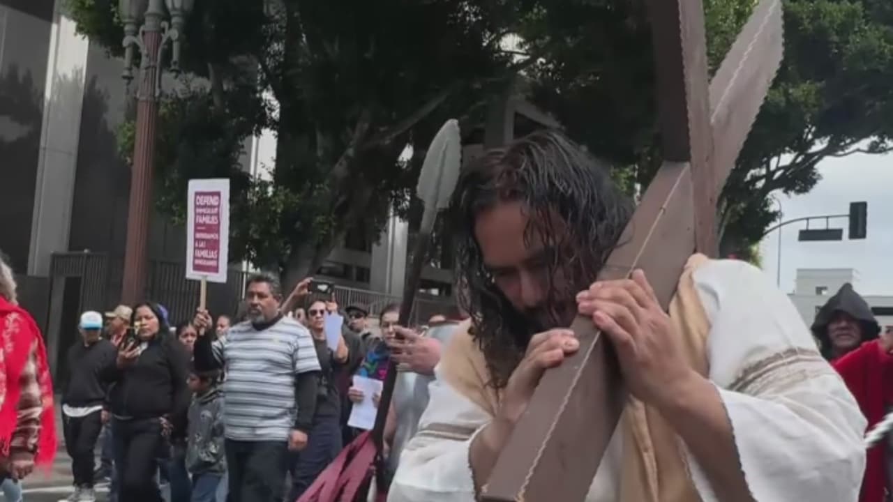 En medio del temor por cuenta de las políticas migratorias de la administración Trump, este Viernes Santo, miembros de la comunidad en Los Ángeles participaron en el que ellos llaman ‘Viacrucis del Jesús Migrante’. El recorrido contó con 14 estaciones, en las que, además de representarse la pasión de Jesucristo, se representó el sufrimiento de los inmigrantes. El acto de crucifixión se llevó a cabo en el ayuntamiento de la ciudad.
