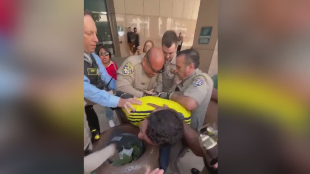 Una manifestación que comenzó de forma pacífica terminó entre empujones, gritos, con un arresto y hasta con un oficial de la Patrulla de Caminos en el piso y desenfundando su arma. El incidente se presentó cuando activistas protestaban en contra de los desalojos y del aumento del costo de la renta afuera de la oficina del gobernador, en el centro de Los Ángeles.