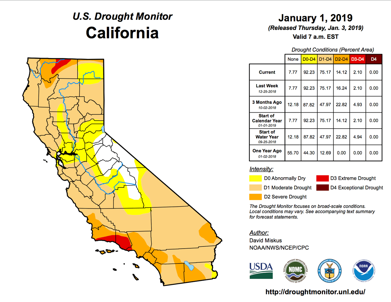 El último informe proporcionado por Monitor de Sequía de Estados Unidos con fecha del 1 de enero de 2019, indica que el estado de California actualmente está experimentando una sequía moderada, aunque esto podría empeorar al pasar los meses y en el caso de que no aumentaran las lluvias, ya que los recursos de agua serían limitados.