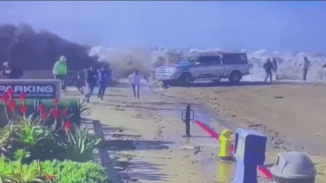 En video: El momento en el que el alto oleaje arrastra un auto y a visitantes en Ventura