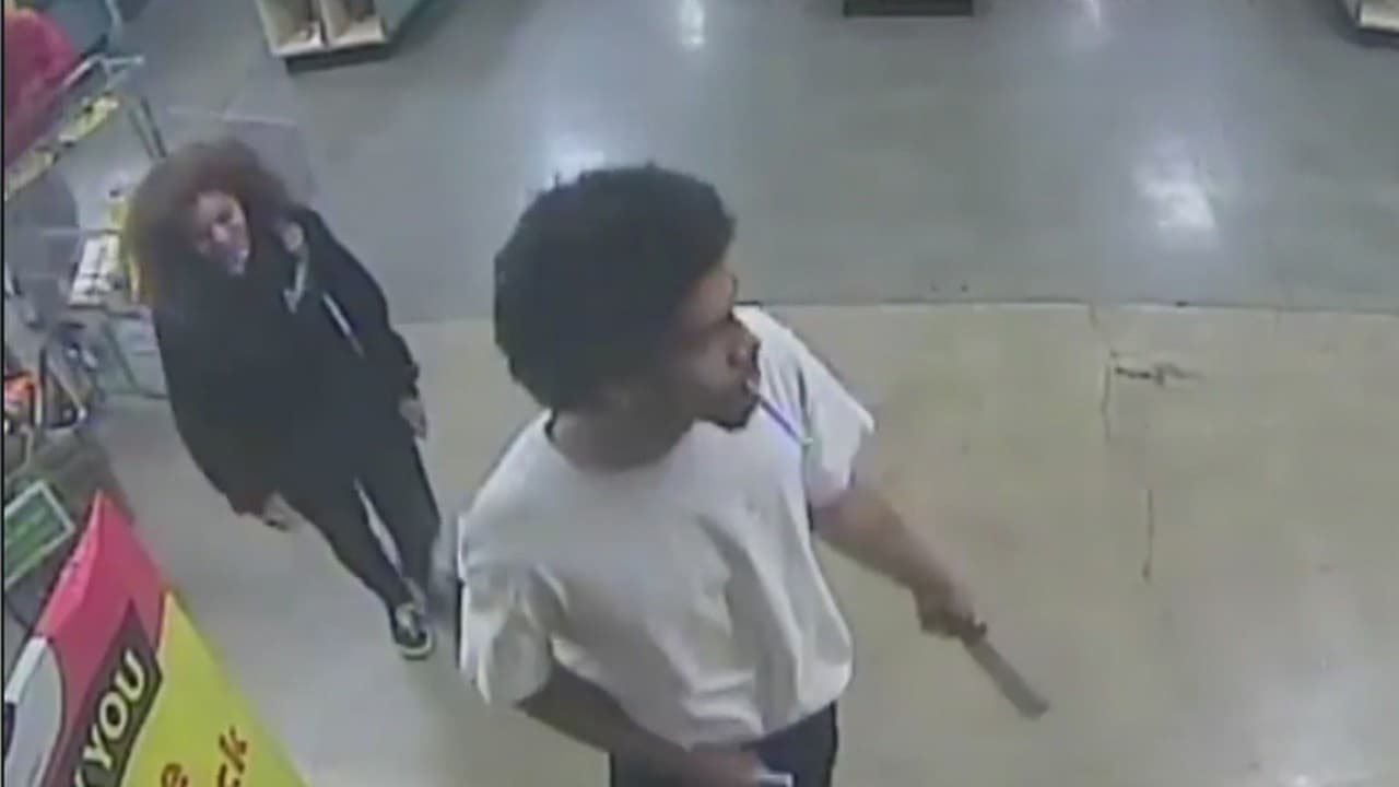 Los sujetos salen de la tienda con un carrito de compras, mostrándole el arma al uniformado. La policía investiga si están relacionados a otros asaltos.