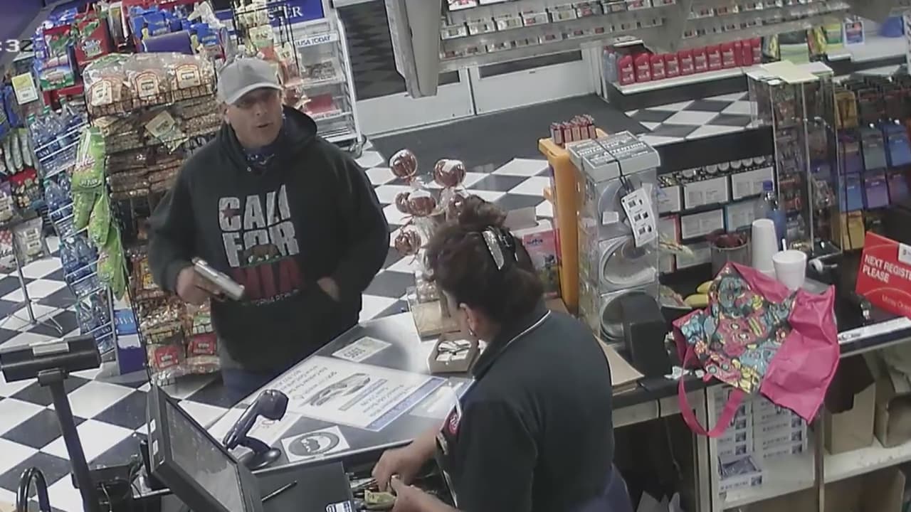 La policía busca al sujeto que quedó captado en cámara cuando saca una pistola para robar en una gasolinera de Santa Ana, California.