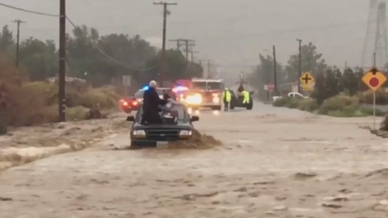 En video: Una pareja queda atrapada en medio de una vía de Riverside totalmente inundada