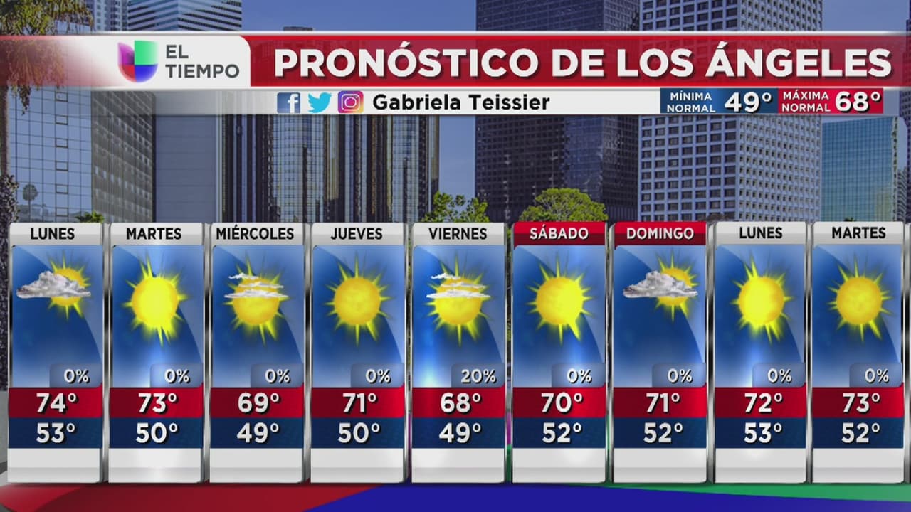 No habrá probabilidades de lluvias durante la jornada en el área. Se pronostica una temperatura máxima de 74 grados Fahrenheit y una mínima de 53 grados.