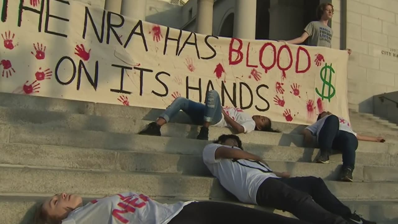 Los protestantes hicieron una representación de los caídos en las masacres y exigieron leyes más estrictas al control de armas de fuego. Este viernes, Dimitrios Pagourtzis, de 17 años de edad, realizó un tiroteo en una escuela de Texas y asesinó a 10 personas. Según el gobernador de ese estado, Greg Abbott, las armas eran propiedad de su padre, quien las adquirió legalmente. El joven compareció en corte y le imputaron cargos de asesinato capital.