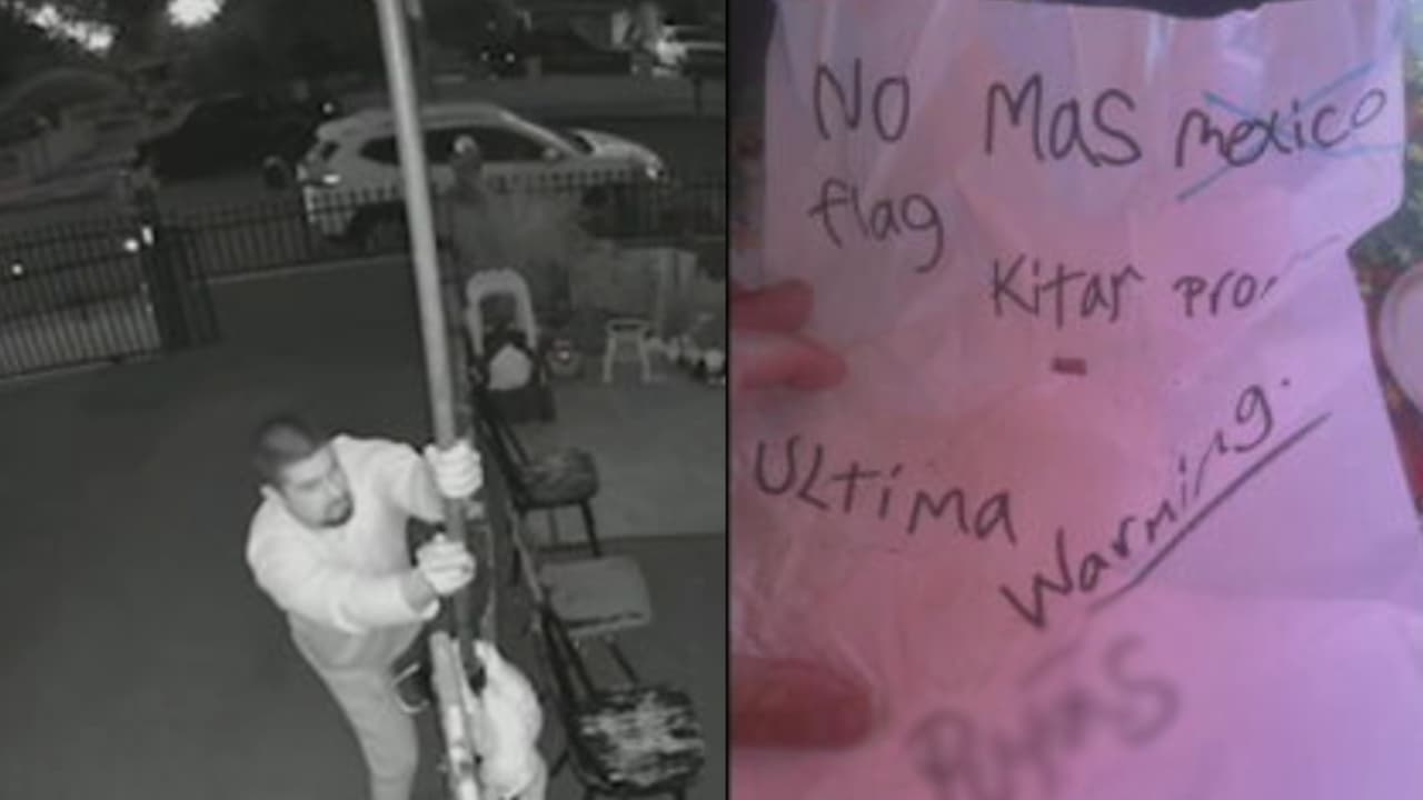 En video quedó captado el momento en que un hombre se lleva una bandera que estaba en la casa de Carlos Antúnez. Según Carlos, lleva casi dos décadas colocando la bandera mexicana junto a la de California en su vivienda, pero el 21 de octubre un desconocido se la llevó y no conforme le pintó una pared con las iniciales USA. Sin embargo, lo que le causa temor es que le dejaron una carta amenazándolo.