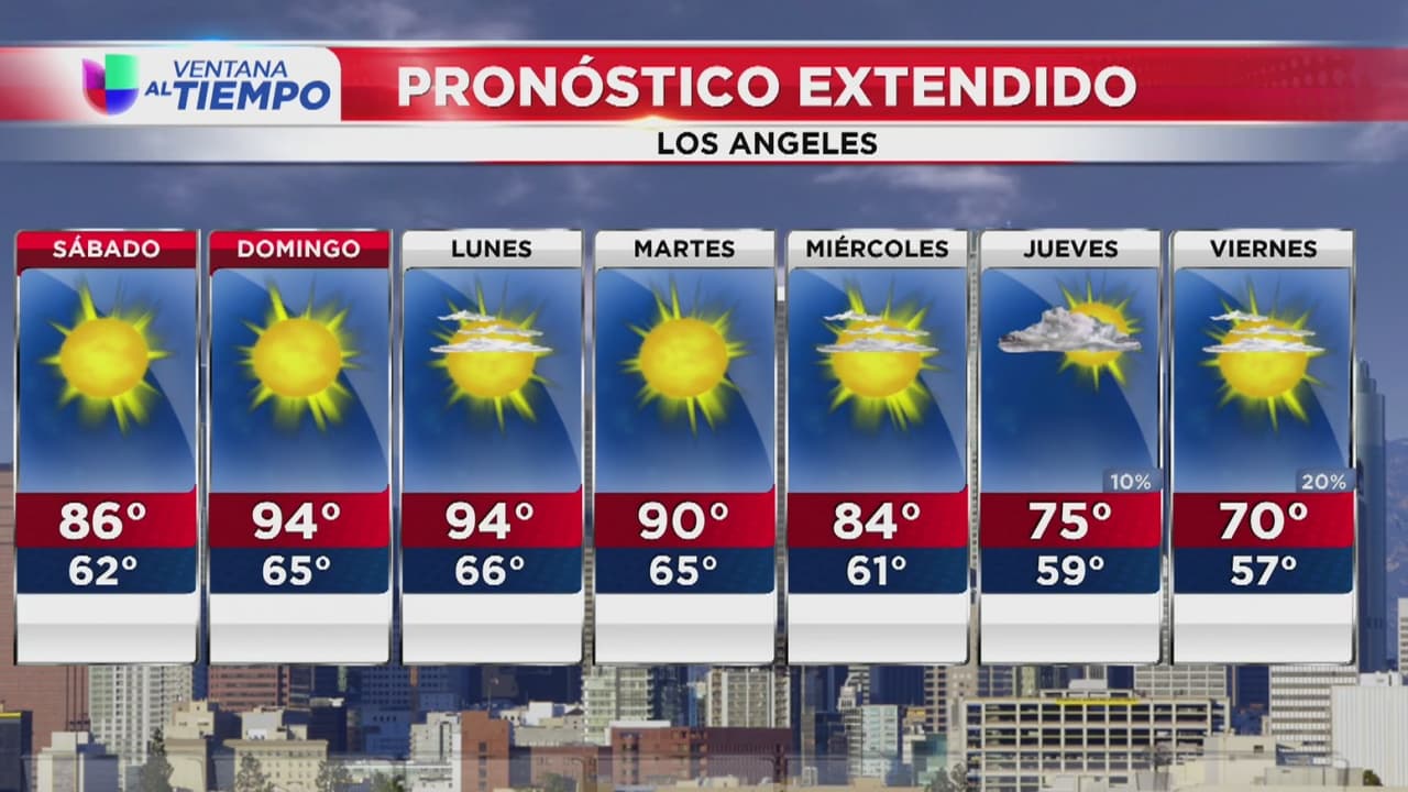 Este sábado se esperan temperaturas máximas de 86 grados mientras que el domingo los termómetros marcarán 94 grados. La semana comenzará con temperaturas elevadas por encima de los 90 grados. La alerta por incendios se mantendrá en el estado hasta el domingo, con posibilidad de ampliarse por unos días más debido a la fuerza de los vientos y la intensidad del calor.
